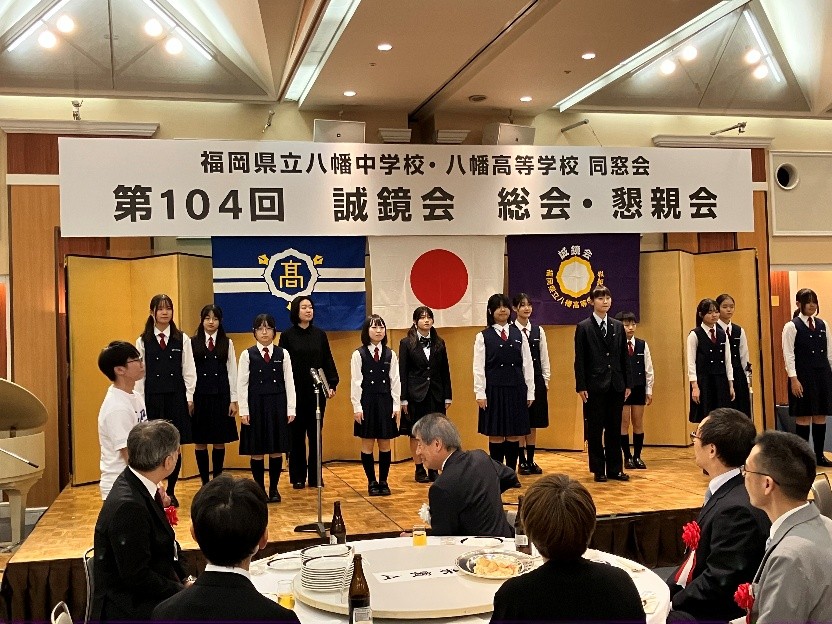 黒光元校長先生の乾杯で始まった懇親会は、一気に賑やかさを増しました。メインイベントとして、北九州アカデミー合唱団によるステージが披露されましたが、ここには現役生や48期の卒業生も参加しており、世代を超えたハーモニーが会場を包みました。