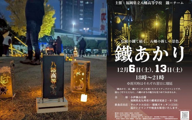 産官学共同で、八幡駅前の魅力づくりを実現。鉄の都のレガシーを受け継ぎ、八幡の歴史と平和への願いを融合させた地域活性化イベント。八幡製鐵所ゆかりの「鐵」製ランタン約100基を、公園一帯にライトアップする夜のイベント「鐡あかり」。令和7年12月6日、14日小伊藤山公園で実施