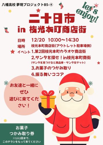 12月20日(土)の二十日市を夢現プロジェクトチームが主体となり、高校生パワーで盛り上げ、カラオケ大会での歌声や、お菓子つかみ取り、ほっとココアの振る舞いなど、小さいお子さんからご高齢の方まで笑顔あふれるイベントで、商店街に賑わいを創り出す試みをしました。